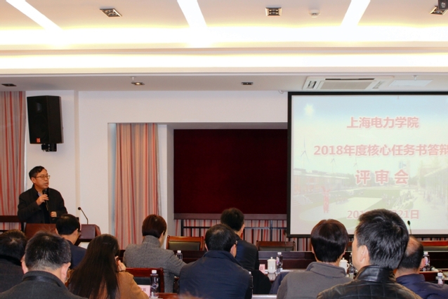 1月21日,正值学校喜庆获批更名上海电力大学之际,在杨浦北校区行政中心九楼一号会议室,全校签约2018年度核心任务书的39家二级单位(部门)负责人齐聚一堂,以答辩汇报形式,接受由各二级单位以及教代会、党代会、民主党派、学术委员会、教授委员会、青年教师、学生等校内各界60个代表组成的评委团的集中评审。全体党政领导班子出席会议,担任评委,听取了答辩汇报。教育综合改革工作组组长、校党委副书记翁培奋主持会议。