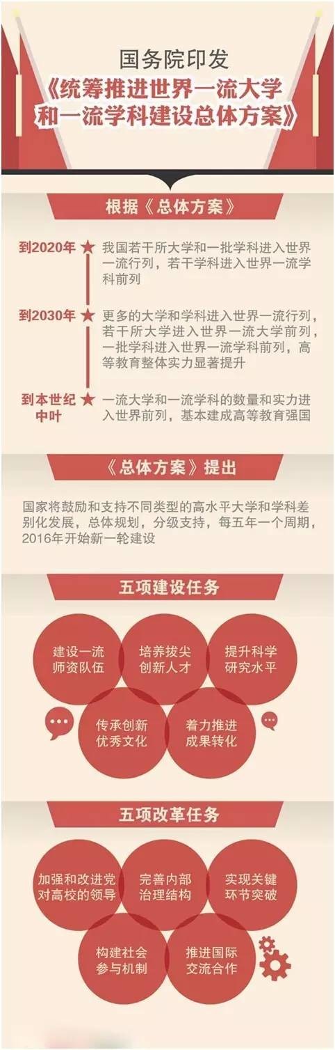 2015年11月,国务院印发的《统筹推进世界一流大学和一流学科建设总体方案》提出: